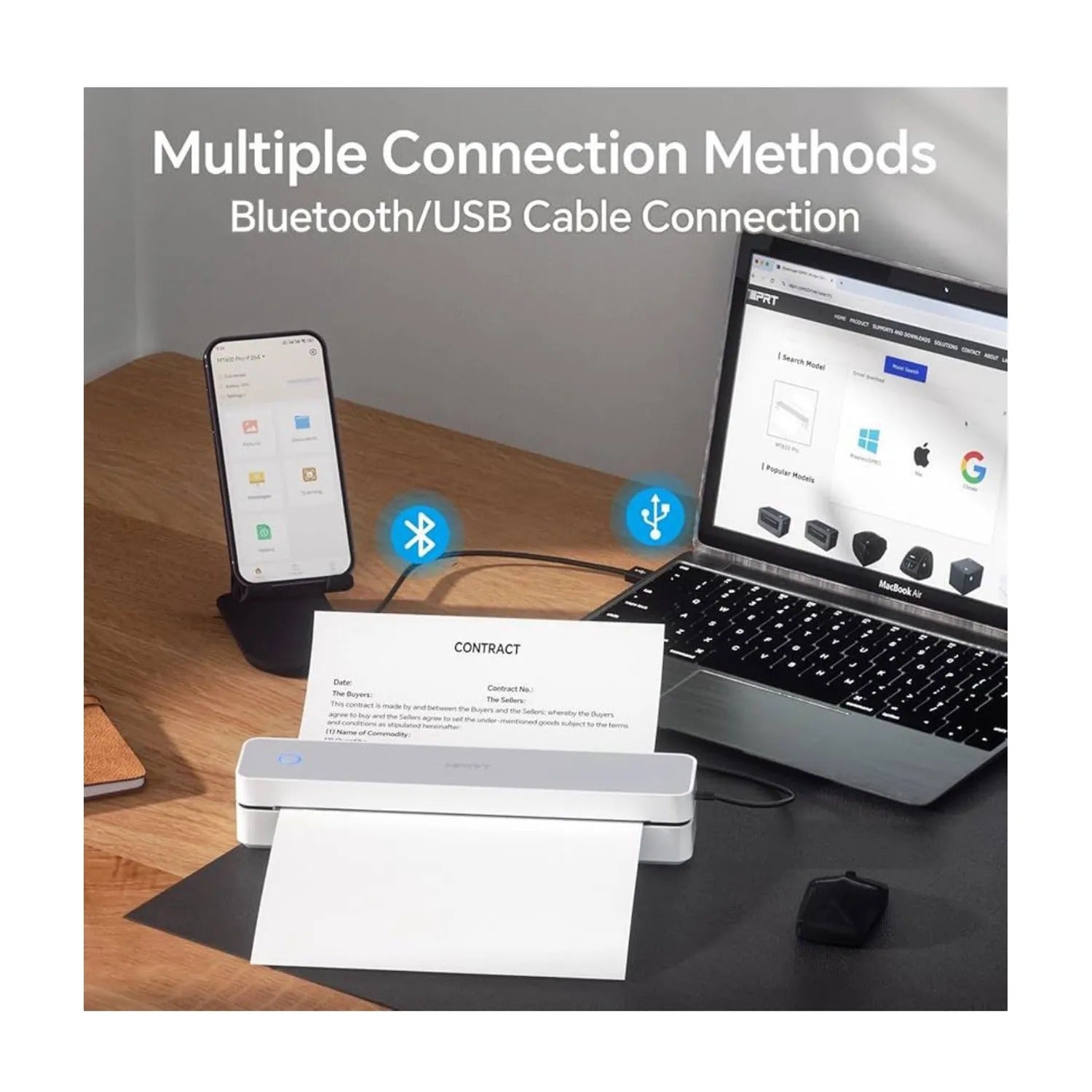 - Conectividad múltiple sin fisuras: esta impresora móvil se puede conectar fácilmente con dispositivos inteligentes (sistemas iOS y Android) a través de Bluetooth. También se puede conectar a través del cable USB incluido cuando se utiliza una computadora