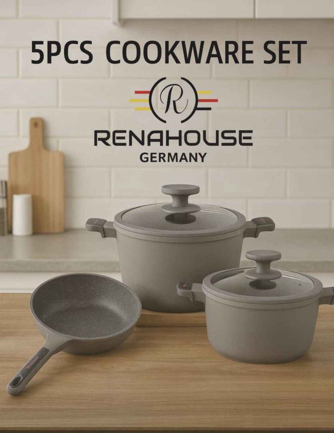 Disfruta de la cocina saludable y elegante con el Set de Ollas Renahouse Germany de 5 piezas, diseñado con materiales de calidad superior y 100% libre de PFOA, plomo y metales pesados.