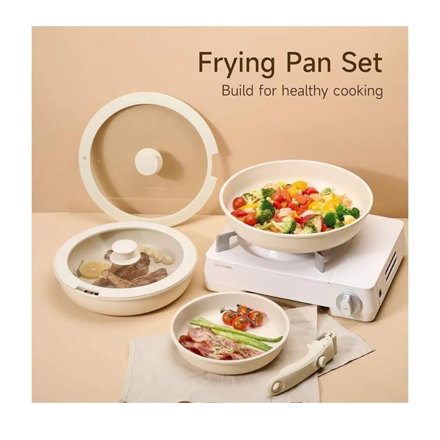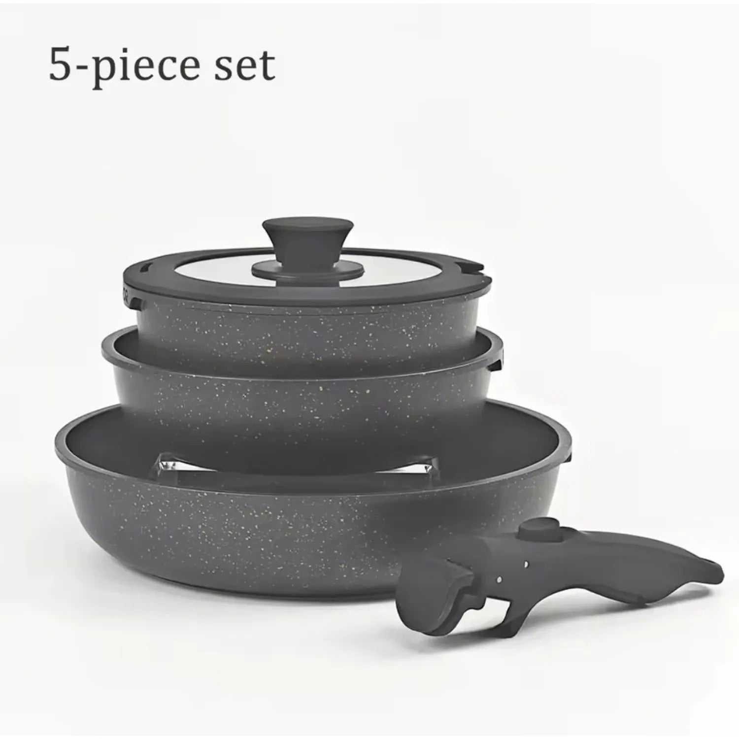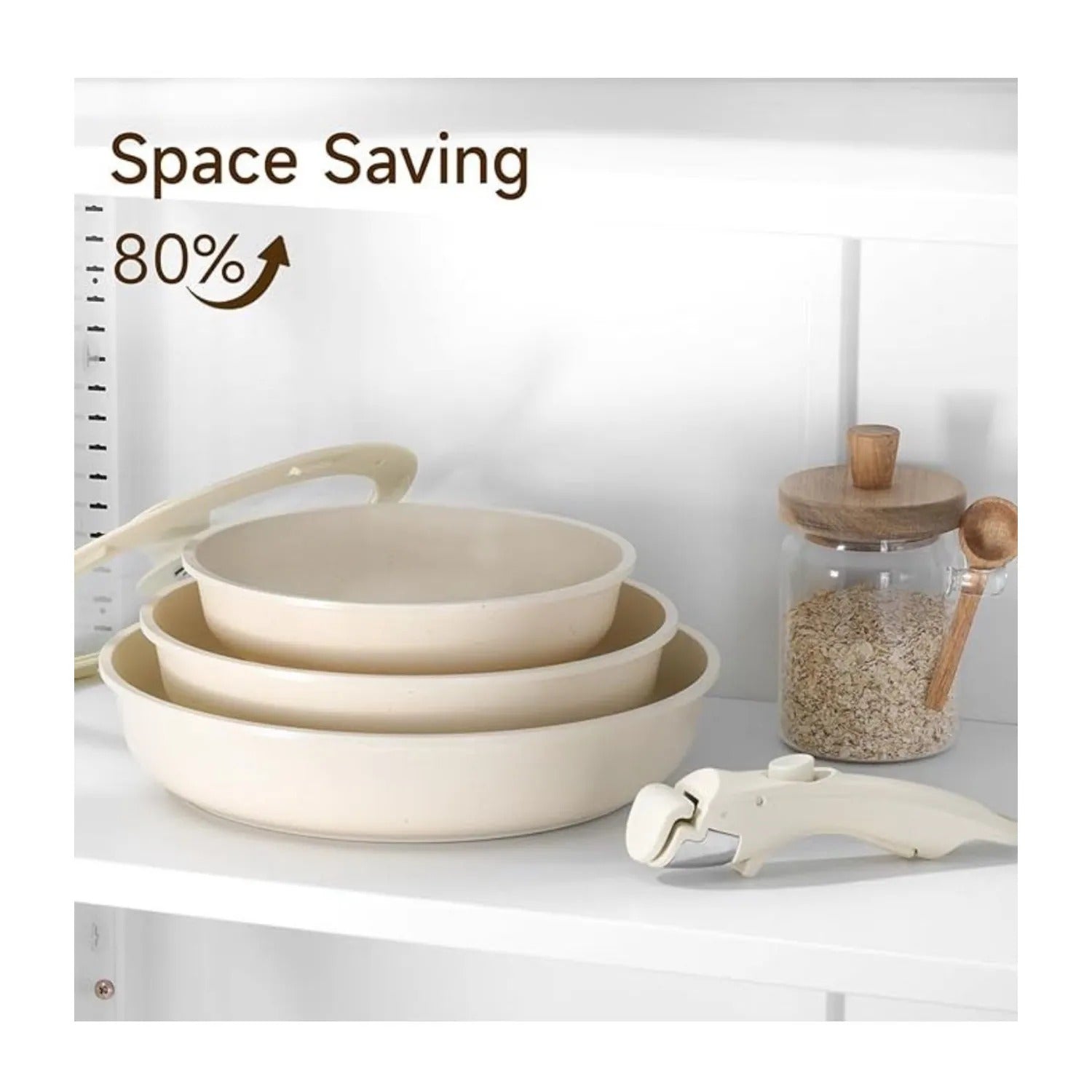 - Fácil almacenamiento: el juego de sartenes con mango extraíble se puede apilar fácilmente en una esquina del gabinete después de su uso, ahorrando hasta un 80% de espacio en comparación con las sartenes tradicionales